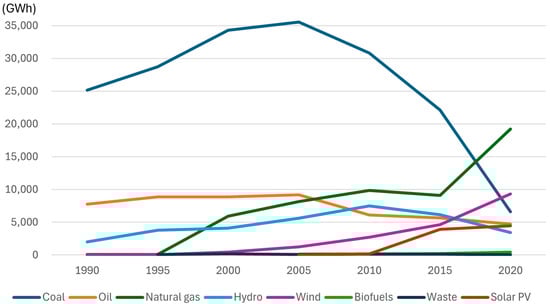 In order to keep the global average temperature rise well below 2 K above pre-industrial levels and to pursue efforts to limit the temperature rise to 1.5 K, the Paris Climate Agreement was signed by 196 countries in 2015 [1]. Greece, as one of the signatory countries, has set national energy policies in different periods to achieve a phased sustainable development. Since the early 1960s, Greece has met most of its electric power demand from thermal power stations burning either lignite on the mainland or heavy fuel oil on the islands. Based on the European Energy Policy, the goal of renewable energy penetration in 2020 (Law 3851/2020) formulated at the national level in Greece in 2010 marked the start of the Greek energy transition [2]. As Figure 1 shows, Greek electric power generation shifted from coal to natural gas by 2020 and wind and solar PV gradually became important sources of electric power generation recently [3]. In terms of power generation resources for Greece, solar accounted for 10.7% of the total installed capacity, while wind accounted for 23% of the total installed capacity in 2023 [4]. For the country’s sustainable development, further electric power generation from renewable energy sources (RESs) is needed. The Greek National Energy and Climate Plan (NECP) aims to deploy renewable energy generation systems on the islands, interconnect them with the electricity grid on the mainland, and phase out most of the heavy fuel oil-based power generation on the islands by 2030. Another policy, the National Climate Law, enacted in May 2022, set targets to achieve a 55% reduction in the total greenhouse gas emissions by 2030, an 80% reduction by 2040, and ultimately reach net zero emissions by 2050 [3]. It also outlined the essential emissions reduction measures and set a binding target to end lignite power generation by 2028.