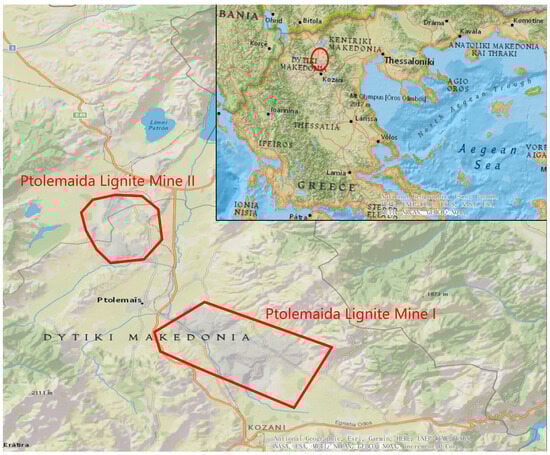 In this section, a lignite mining site in Megalopoli (Figure 2) and two lignite mining sites in Ptolemaida (Figure 3) were chosen as the study areas. The Ptolemaida Mine of Western Macedonia located in the northern part of Greece is the largest lignite mine in the whole of Greece, followed by what is the largest lignite mine in the Peloponnese Peninsula of Southern Greece, the Megalopoli Mine [49]. Due to the extension of operation at the Megalopoli lignite power station until 2025 and the expected closure of the Ptolemaida lignite power station in 2028, lignite mines in both regions are still in use. However, with the mandatory and inevitable shutdown of lignite power station in Megalopoli, the adjacent mine will be decommissioned in parallel, since lignite is not suitable for long-distance transport.
