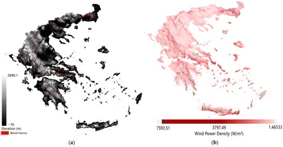 By the end of 2022, the cumulative installed wind power capacity in Greece reached 4681.4 MW [50]. Wind turbines are predominantly distributed in Thrace, Western Macedonia, Central Greece, and the Peloponnese. Meanwhile, the altitude at which the wind farms were constructed is depicted in Figure 5a. The color of an area corresponds to its altitude, with high altitudes being represented by lighter shades and lower altitude by darker shades. The altitude values adhere to this color scheme in the subsequent diagrams related to DEM. Additionally, Figure 5b presents a WPD map combined with the locations of the existing wind farms. In this map, areas with a redder hue indicate higher mean WPD values, whereas areas with lighter shades of red correspond to lower mean WPD values. It is worth noting that the majority of the wind turbines were installed at relatively high altitudes, as shown in Figure 5a, specifically on mountain ridges. These areas exhibit higher mean WPD values in Greece, as indicated in Figure 5b, and higher average WPD values signify more abundant and favorable wind resources [19].