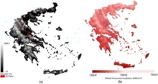 Figure 6 displays the current areas in Greece where PV parks have been constructed. The total land area occupied by PV parks is 1984 km2, accounting for 1.5% of the total land area of Greece. According to Petrova [51], the cumulative capacity of PV parks in Greece reached 5488 MWp in 2023. Meanwhile, it can be noted that the current PV parks are predominantly situated in Western Macedonia and Thessaly, where they are constructed on flat terrain with a relatively low elevation, as shown in Figure 7a. Since the GHI values can accurately quantify the solar energy potential for PV [52], higher GHI values correspond to a greater solar energy potential. Therefore, PV parks are strategically constructed in areas with relatively high GHI values, as shown in Figure 7b.