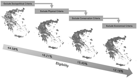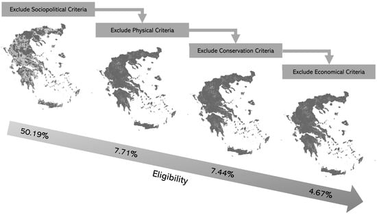 As stated in Section 3.4, the Natura 2000 areas were excluded from the start of analysis. The remaining socio-political, physical, conservation, and economic constraints were excluded sequentially using GLAES (Figure 8). Upon the exclusion of the socio-political criteria, the land eligibility for onshore wind turbines in Greece was determined to be 44.58%. However, after excluding the physical criteria, the land eligibility ratio dramatically decreased to 16.21% and further dropped to 15.45% after excluding the conservation criteria. Finally, after excluding the economic criteria, the land eligibility for onshore wind turbines in Greece was determined to be 12.16%. Figure 8 clearly indicates that the physical criteria significantly impact the feasibility of constructing onshore wind turbines in Greece. Furthermore, among the economic criteria, the slope is the factor that most affects land eligibility; if the slope criterion is not excluded, land eligibility for onshore wind in Greece increases to 19.9%.