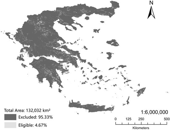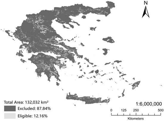 Land eligibility is a process that evaluates the suitability of a land parcel for implementing a specific technology based on a predetermined set of exclusion constraints and serves as a fundamental and widely utilized procedure through which geospatial criteria shape the distribution patterns across a given region [22]. Since not all open fields are eligible for the installation of wind turbines and PV power plants, land eligibility analysis based on geospatial data is an essential step before analyzing RES potential.
