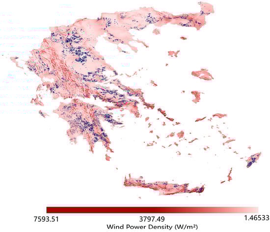 To provide a visual representation of the land eligibility for onshore wind turbines, Figure 9 presents a map where the eligible area constitutes 16,055 km2, accounting for 12.16% of the total Greek area. Additionally, Figure 10 combines the predicted wind turbine locations with the mean WPD map of Greece. These figures demonstrate that the projected wind turbine sites are concentrated in Western Macedonia and Northern Thessaly, the eastern part of Central Greece, the Peloponnese, and the islands of Crete and Rhodes. As mentioned in Section 4.1, areas with a higher mean WPD are predominantly situated in mountainous regions with high altitudes. However, most eligible areas predicted by GLAES are distributed across flat terrain with relatively low mean WPD values. Only a few areas with a high mean WPD, such as the island of Crete and the junction area of the southern part of Central Greece and Attica, can support wind turbine construction.