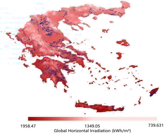 Figure 12 illustrates a map displaying the eligible areas for open-field PV power plants as predicted by GLAES. The total eligible area in Greece encompasses 6166 km2, accounting for 4.67% of the country’s total land surface. The predicted open-field PV power plant locations are predominantly on flat terrain. Moreover, Figure 13 clearly shows the relatively high mean GHI values in the eligible areas, particularly in the southern regions of Greece, such as the Peloponnese and the islands of Crete and Rhodes. These regions present peak GHI values, indicating the substantial solar energy potential of open-field PV installations in the predicted eligible land areas.
