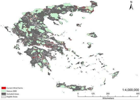 Unsuitable areas for wind turbines’ construction and the existing wind farms in Greece. White areas present the eligible land, while gray areas present the unsuitable land. Green areas and red areas, respectively, stand for Natura 2000 sites and the current wind farms.