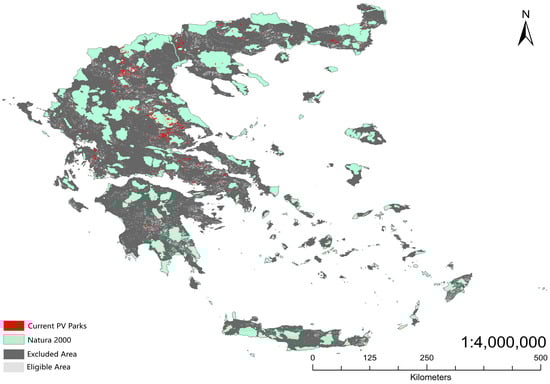 Unsuitable areas for the construction of PV power plants and the existing PV parks in Greece. White areas present the eligible land, while gray areas present the unsuitable land. Green areas and red areas, respectively, stand for Natura 2000 sites and the current PV parks.