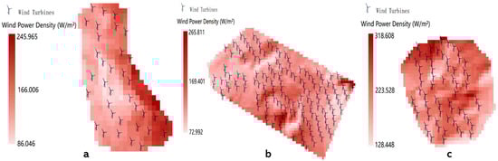 (a) Simulated placements of wind turbines with the WPD map of the Megalopoli Mine. (b) Simulated placements of wind turbines with the WPD map of the Ptolemaida I Mine. (c) Simulated placements of wind turbines with the WPD map of the Ptolemaida II Mine.