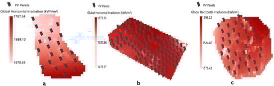 (a) Simulated placements of PV parks with the GHI map of the Megalopoli Mine. (b) Simulated placements of PV parks with the GHI map of the Ptolemaida I Mine. (c) Simulated placements of PV parks with the GHI map of the Ptolemaida II Mine.
