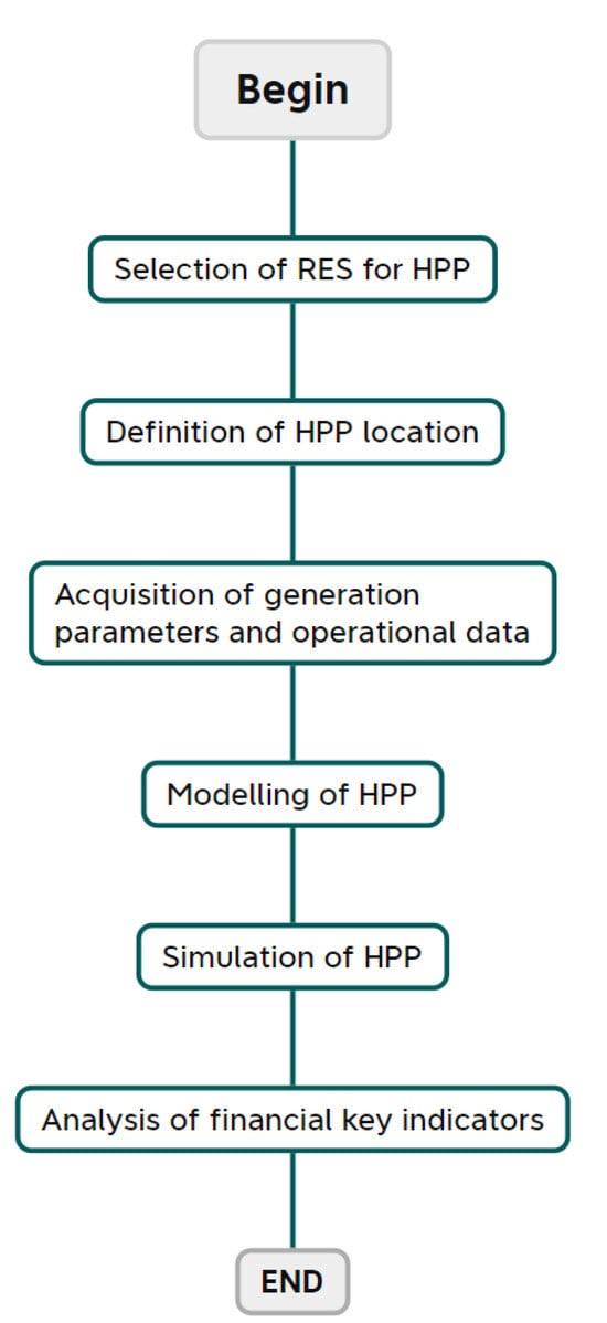 Flowchart of the methodological approach for a techno-economic feasibility HPP study.