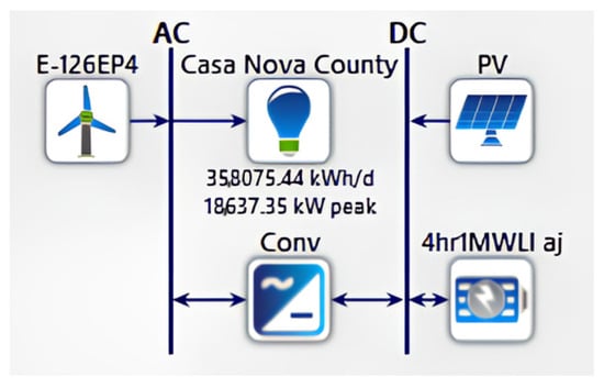 Regarding the hybrid system itself, which was implemented in HOMER Pro, Figure 3 shows the connections between the DC and AC buses that composed the hybrid plant and served the load. Each of the HPP subsystems are highlighted, including the PV, WT, BESS, converters, and the connection with the load.