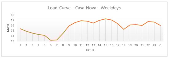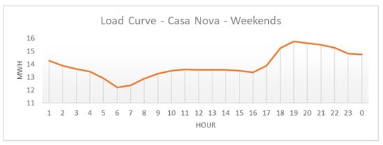 From the data collection and processing presented in Section 2.2.3, it was found that the state of Bahia represented 30.12% of the Northeast’s consumption in the year 2016 []. Additionally, the percentage of Casa Nova in relation to the Northeast region was approximately 0.4971%. Figure 4 and Figure 5 show the load curves obtained for Casa Nova city, considering weekdays and weekends, respectively, representing the consumption behavior of the region. In these curves, the average power consumed by the load is plotted for each hour of the day in 2016.