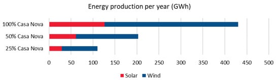 Regarding the energy production from each of the sources, Figure 6 shows a graphical comparison of each of the three scenarios, highlighting the share of each RES used.