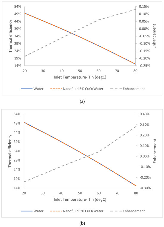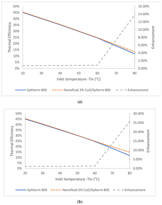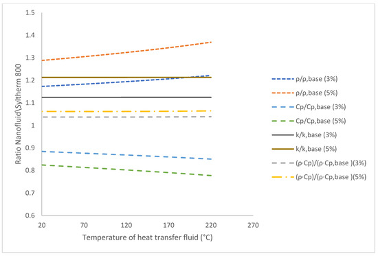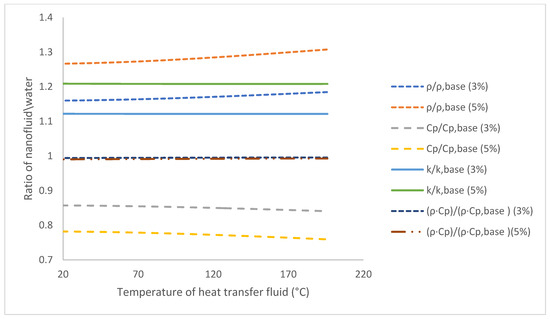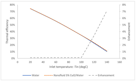 - The nanoparticles’ addition slightly reduced the thermal efficiency at low temperatures, and it increased it remarkably at higher ones. This happened due to the lower volumetric specific heat capacity and the higher thermal conductivity of the nanofluid compared to the based one. The first parameter seemed to be more important in low temperatures, while the second one seemed to have greater impact at high temperatures by overcoming the limitation of the volumetric specific heat capacity.