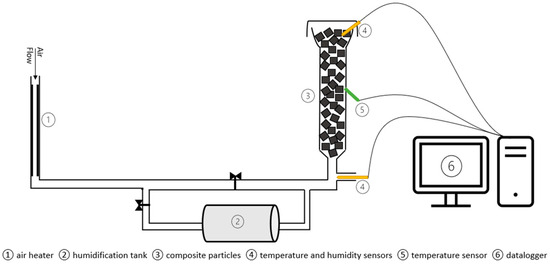 To further examine the performance of composites, a lab-scale packed bed reactor (Figure 1) was used and made from a 298 mm long cylindrical glass tube with 22 mm radius and 5 mm wall thickness. The reactor was insulated with 12 mm thick neoprene. Compressed air was fed into the FC Series™ humidifier (Perma Pure, NJ, USA) at the desired temperature and flow rate to humidify the air. The reactor was operated at atmospheric pressure. Data were recorded by two temperature–humidity sensors (HygroClip2 (Rotronic AG, Bassersdorf, Switzerland) screw-in probe with a temperature accuracy of ±0.1 °C and relative humidity accuracy of ±0.8% RH) placed at the inlet and outlet of the reactor and temperature sensors (Type K thermocouple (RS Components, London, UK) with an accuracy of ±0.4%) at the inlet, middle, and top of the reactor. The data were digitized using a data logger and recorded on a computer. To investigate the effect of inlet air flow rate and humidity, four conditions—20 L/min at 50%, 60%, and 70% RH, as well as 30 L/min at 70% RH—were used, while the inlet temperature was kept constant at 20 °C. These hydration/dehydration experiments were carried out in duplicate, totaling 8 cycles for each composite.