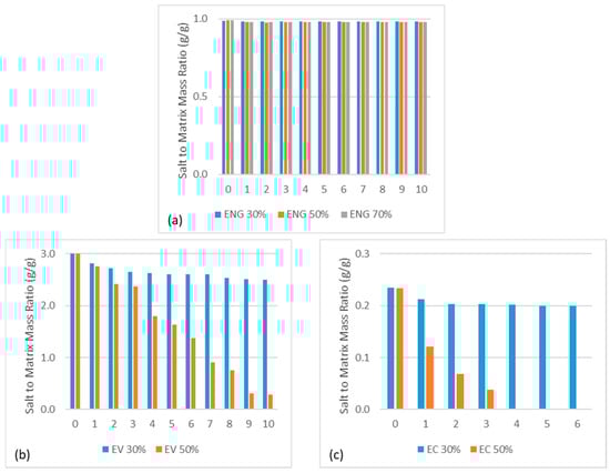 Salt to original matrix mass ratio over hydration/dehydration cycles at 20 °C and varying humidity of (a) ENG, (b) EV, and (c) EC CaCl2 composites.