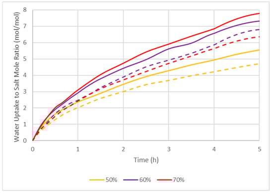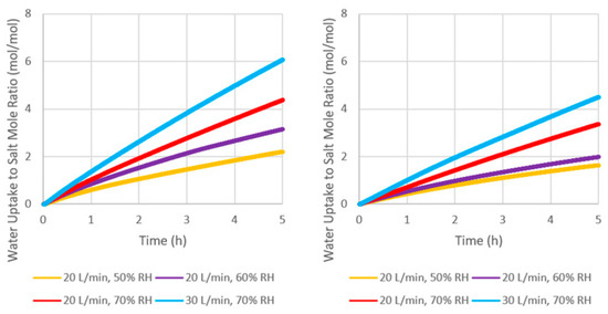 Water uptake behavior was calculated based on the absolute humidity difference between the inlet and outlet that were gathered from temperature and humidity sensors. The behavior is shown in Figure 6, and the time needed to form 6 moles of water is summarized in Table 5. As the inlet humidity and flow rate were increased, the time needed to gain 6 moles of water/mole of salt was significantly reduced. This is because an increase in humidity resulted in higher water vapor pressure while an increase in flow rate ensured high-humidity air over the whole bed, pushing the equilibrium reaction to be more product-favored and promoting water mass transport. The water uptake performance of ENG/CaCl2 was better than the eutectic composite due to incomplete magnesium chloride hydrate dehydration and the less hygroscopic nature of the magnesium salt compared to calcium salt, as stated earlier. Increasing the humidity from 50% to 70% at 20 L/min reduced the time needed to uptake 6 moles of water by over 8 and 10 h for ENG/CaCl2 and ENG/eutectic, respectively (Table 5). However, this is different from the results obtained in the humidity chamber, where the particles were not packed, and the humidity exposed to them was constant (Table 5). This was improved by increasing the flow rate to 30 L/min, where a 30% improvement can be seen. The difference between the two composites observed in the reactor was consistent with the results obtained from the hydration kinetics study performed in the humidity chamber (Figure 4, Section 3.2.2).