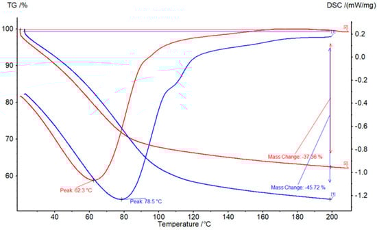 A thermal analyzer (STA 449 F5 Jupiter, NETZSCH, Selb, Germany) was used to investigate the dehydration behavior and endothermic effect of selected composites after hydration. A known mass of the sample (approximately 15 mg) was placed in an alumina crucible and subjected to a constant heating rate of 5 °C/min from room temperature to 200 °C whilst the chamber was continuously fed with argon as inert gas at 50 mL/min.