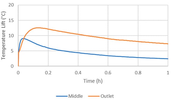 At the beginning of hydration, the temperature lift was high due to the rapid formation of monohydrates and dihydrates (Figure 7). A lag in the time taken to achieve the highest middle and outlet temperature was observed for all experiments, usually by approximately 10 min (Figure 7). This was due to the rapid depletion of water in the air as it traveled up the column, as well as due to the sensible heating of the reactor.