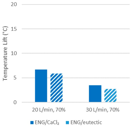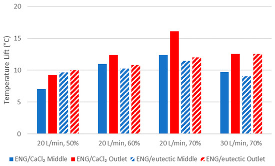 The maximum middle and outlet temperature lift for both composites are shown in Figure 8. A higher inlet humidity resulted in a greater temperature lift due to higher concentrations of water in the air. The greater the inlet humidity, the poorer ENG/eutectic performed in terms of maximum temperature lift compared to ENG/CaCl2. At 50% RH, the maximum outlet temperature and water uptake were similar between ENG/CaCl2 and ENG/eutectic. The highest maximum temperature lift of 16 °C was achieved using ENG/CaCl2 at 20 L/min and 70% RH, which is 4 °C higher than the ENG/eutectic. In most cases, increasing the inlet flow rate decreased the maximum temperature lift despite increasing the water uptake rate. This is because the increase in the rate of water uptake did not increase by the same factor. As the flow rate was increased to 30 L/min, two composites achieved similar maximum temperature lift.