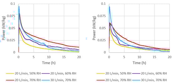 It was shown in Section 3.3.2 that an increase in humidity and flow rate both increased water uptake rate (Figure 6 and Table 5), thereby also increasing the rate of heat release from the hydration reaction, resulting in higher real power output (Figure 10 and Figure 11). It can also be observed that even though the peak power output was similar for the two composites, except for 20 L/min and 70% RH, the output from ENG/CaCl2 was more persistent. This is because at lower humidity (50%), the formation rate of dihydrates was similar, but CaCl2 can uptake more water than MgCl2 and at a faster rate. The greater the inlet humidity, the greater the difference in power output seen between the two composites, where ENG/CaCl2 performed much better. At 20 L/min and 70% RH, the CaCl2 composite achieved a maximum of 0.082 kW/kg, which is higher than the eutectic composite which peaked at 0.061 kW/kg.