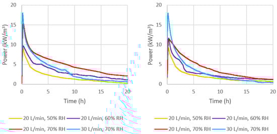 It is also important to evaluate the volumetric power output, where a higher value would result in smaller system volume, which is important especially given that the capital cost of reactors depends on the volume. From Figure 11, the maximum volumetric power output of ENG/CaCl2 is 15.4 kW/m3, which is 40% greater than ENG/eutectic at 20 L/min and 70% RH. As the flow rate was increased to 30 L/min at the same humidity, the highest peak power output was achieved compared to all other tested conditions, at roughly 0.094 kW/kg or 17.4 kW/m3 by both composites; however, this leveled off much more quickly.