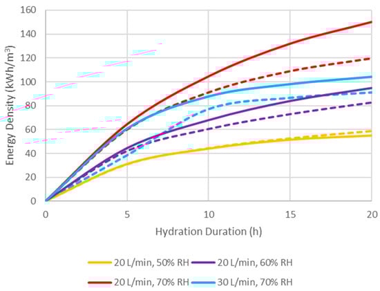 The volumetric thermal energy density at any time can be calculated by integration of the area under the hydration power curve (Equation (9)) from both composites at different conditions and these are shown in Figure 12. According to the results, ENG/CaCl2 performed consistently better than ENG/eutectic, and the greater the inlet humidity, the greater the difference in performance. Increasing the humidity resulted in total generated power in the same amount of time; however, increasing the flow rate accomplished the opposite despite the higher power output peak. The highest energy storage achieved in 20 h was 150 kWh and 120 kWh per cubic meter of ENG/CaCl2 and ENG/eutectic composites, respectively, at a low flow rate and high humidity (20 L/min and 70% RH). However, the power curve leveled off after 10 h at lower humidity (50%) due to a low reaction rate, and at a higher flow rate due to faster heat exchange. Due to the hygroscopic nature of the impregnated salt, even at 20 L/min and 50% RH, the composite can become fully hydrated after an extended time, reaching the maximum theoretical energy density in an ideal system (Table 5).