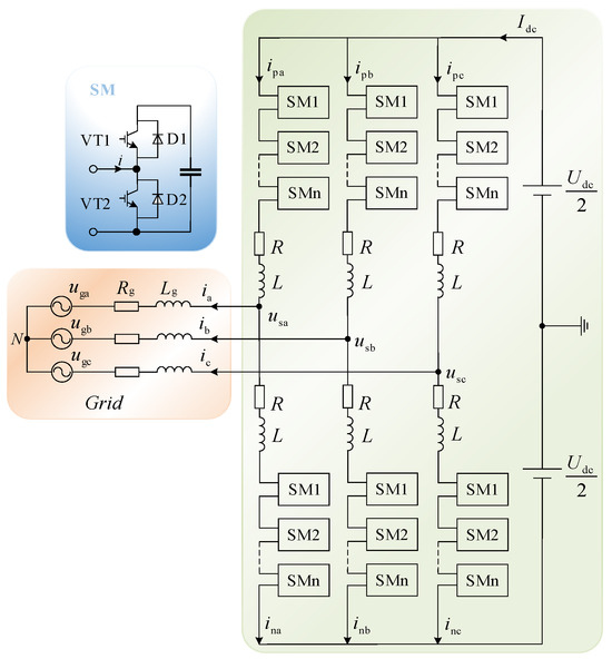 The development of power electronic devices has led to the transformation of direct current transmission from the initial two-level converter to the three-level converter and finally to MMC. MMC has significant advantages in transmission efficiency and topology, compared to traditional converters, making it a popular choice for flexible direct current transmission [1]. However, the complex structure of MMC makes it difficult to control, and power quality and system reliability are still problematic in the event of a grid fault resulting in voltage imbalance or disturbances [2,3]. Therefore, further research is needed to improve the control under unbalanced grid conditions.