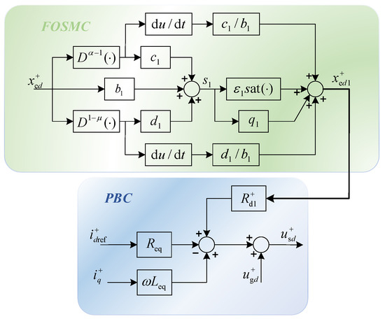 Figure 4 illustrates the FOSMC-PBC control of the d-axis under positive order components, where the passive controller is the main part. The original input of the passive controller is controlled by a fractional-order sliding mode, thus obtaining a new state with sliding mode properties, which is used as the new input of the passive controller, during which the state will gradually converge to the equilibrium point along the fractional-order sliding mode surface, and the energy storage function of the system will gradually converge to 0. By combining the advantages of the two controllers, FOSMC and PBC, and letting them both “join hands”, the controller designed in this paper has both passive characteristics and strong anti-jamming ability, and at the same time can realize smaller jitter. Therefore, the proposed FOSMC-PBC control can obtain good dynamic response and strong robustness.