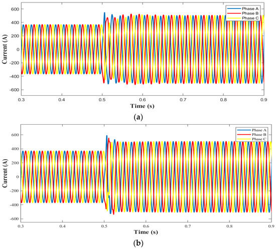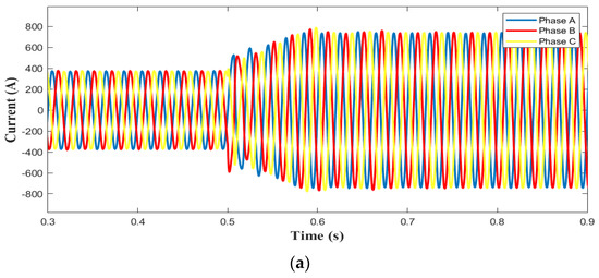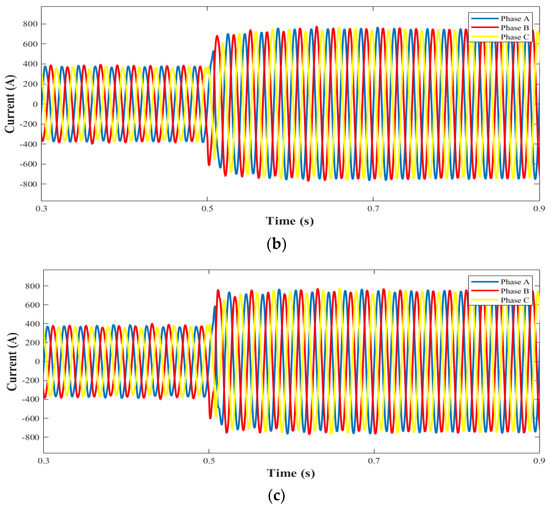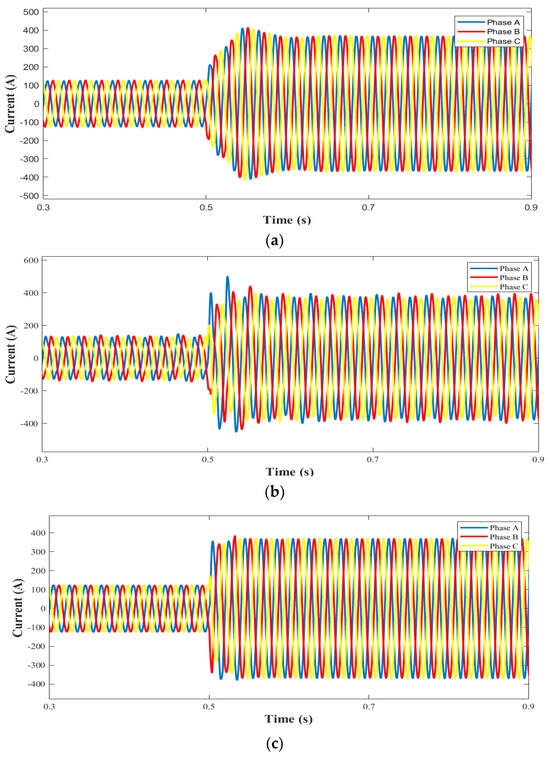 Figure 9 shows the grid-side current waveforms. Due to the occurrence of a three-phase symmetry fault, the current increases rapidly, and after a period of time, balancing is restored. Under the FOSMC-RBFPBC control, the regulation time of the system is much shorter than that of the remaining two control strategies, and the quality of the current waveform is higher.