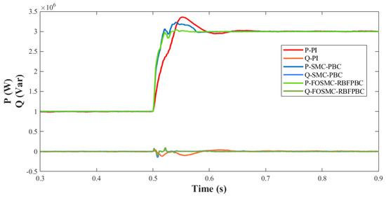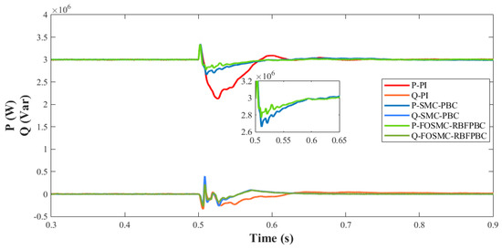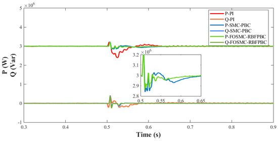 Figure 10 shows the output power waveforms, and it can be seen that the FOSMC-RBFPBC control not only has a faster regulation time but also has fewer power drops for dealing with the perturbation of the three-phase symmetry fault.