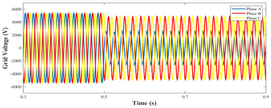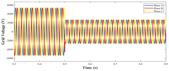 In the initial stage, the active power is set to 3 MW, the reactive power is set to 0 MVar, and a 0.5 p.u. three-phase symmetrical fault occurs at 1 s. The grid-side voltage waveform is shown in Figure 8.