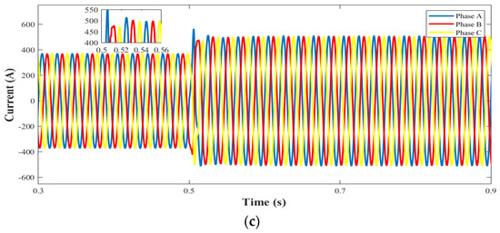 Figure 6 shows the grid-side current waveforms, and Figure 6a–c use PI control, SMC-PBC control, and FOSMC-RBFPBC control, respectively. From Figure 6, it can be seen that the three control strategies can stabilize the system when coping with the sudden change in the load on the grid side, but it can be clearly seen that the PI control can cope with the lack of the ability to deal with the sudden change in the load, and its response speed is slow, and the regulation time is long; the SMC-PBC control, although it has been improved compared with the PI control, will make the current after smoothening the chattering due to the chattering problem that exists in the sliding mode, and FOSMC-RBFPBC control not only improves this chattering situation, but also has a smoother current, smaller overshoot, faster regulation time, and significantly better dynamic performance than the other two control strategies.