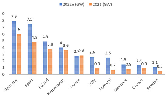 In 2019, a record 22% increase in the PV solar market was witnessed, while China was the world’s largest market for PV during that time [6]. Additionally, in the European Union (EU), solar technology had a highly successful year in 2019 due to a rise in installed capacity, which increased by 104% compared to the previous year. The rise in installed capacity prices was linked to several factors, including the member states targets for 2020 emissions, the competitive price of solar energy, tendering and auctioning mechanisms, storage, digitalization, and self-consumption. Figure 1 shows the top 10 solar PV markets of EU27 in the assessment year 2021–2022. It shows Germany is at the top, followed by Spain, and at the end, Sweden is in the market [7].
