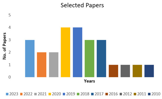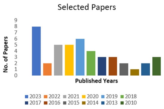 There are several existing ways to classify PVT systems. For the classifications, a numerous research study was conducted, and literature review was performed. The selected publications were analyzed and collected from the years 2010–2023. The following Figure 7 shows the yearly view of the selected articles for the classification purpose, which is shown in Table 1.