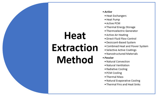The above Figure 10 describes the PVT system’s classification based on possible heat extraction medium/method that could be used in the system. It is proposed two types of heat extraction method in the classification which is active and passive. In active heat extraction method, there are several types like heat exchangers mechanism, heat pump, active PCM, thermal energy storage, thermos electric generator, active air heating, direct fluid flow control, desiccant-based system, combined heat and power system, selective active coatings, and nanostructured materials. On the other hand, passive type includes natural convection, natural ventilation, radiative cooling, PCM cooling, thermal mass, natural evaporative cooling, thermal fins, and heat sinks.