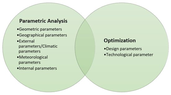 Figure 12 shows the classification of summarized topics described in the studied research papers. From this figure, it can be seen that most of the authors chose to depend on parametric analysis to evaluate the efficiency of hybrid PVT systems; on the other hand, many of them chose to evaluate parameters with the optimization method. Parametric analysis also varies from author to author. For example, many authors focused on only climatic parameters; others focused on design parameters [69] or meteorological parameters [70], and a few of them described both climatic and geometric parameters. Fluid flow with air velocities, including its shape, is studied in [71]. The author of [72] focused on temperature and the different fin shapes of the system.