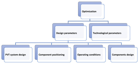 The author [74] focused on specific parameters for the evaluation purpose. Optimization based on geometric parameters is considered in [75]. In addition to climatic parameters, it is considered the position of the PVT system for the performance analysis [76]. Parametric analysis with design parameters and weather conditions is discussed in [53]. Incidence angle and electrical losses with climatic parameters are studied in [78]. Air temperature is another important parameter in the analysis of hybrid PVT system performance, which is discussed in [79]. For that purpose, many authors [1,22] considered active or passive colling for the efficiency increase. Design parameter optimization is given importance for the performance evaluation purpose in [56,57,58].