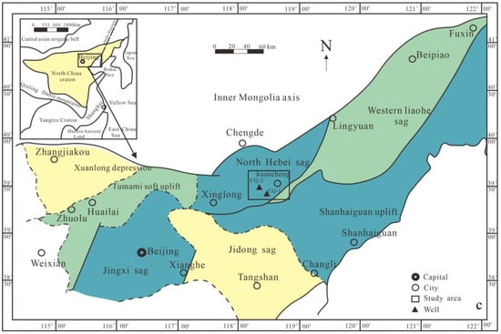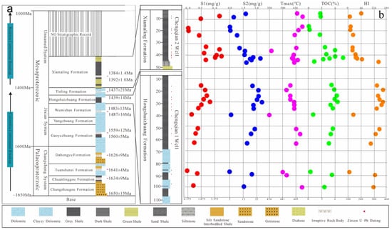 North China Craton (NCC) is a well-preserved ancient landmass in China, with ancient historical sites dating back over 3.8 billion years. Its tectonic evolution is complex and the rock types are diverse and highly characteristic. The Yanshan area in the northern part of the craton has the most complete Mesoproterozoic strata, covering an area of approximately 10.6 × 104 km2 and presenting a development pattern of “five depressions and two uplifts”. The central position of this area consists of “two uplifts” [], while the Jibei depression is located in the central north of the Yanshan sedimentary belt, extending from the Mihuai uplift to the Inner Mongolia axis, in an east–west direction, with an additional north-east-east transformation towards its eastern end, covering an area of 8733 km2 []. Among them, the Mesoproterozoic strata are widely distributed with complete stratigraphic sequences; more than 100 surface oil seedlings and asphalt nodules have been found [], which hold great potential for oil and gas exploration and development. In North China’s northern region, strata are well-developed, mainly on the Inner Mongolia axis, with a weak metamorphic degree (below greenschist facies) but good continuous sedimentary preservation. This study focuses primarily on the Mesoproterozoic Hongshuizhuang Formation and the Xiamaling Formation in northern North China (Figure 1). Using a zircon U–Pb dating method, we obtained numerous high-precision age data, combined with an assumed average deposition rate that limits the lower/upper ages for the Xiamaling Formation at about 1400 Ma/1320 Ma, respectively [], while the Hongshuizhuang Formation’s sedimentary age ranges between approximately 1470 and 1450 Ma []. The Xiamaling Formation comprises a complete sedimentary cycle, characterized by a relative rise and subsequent fall in sea level, which can be subdivided into four distinct sections from bottom to top. The first member of the Xiamaling Formation is composed of silty shale, and its color changes upward, from greenish yellow to light gray to dark gray. Iron-rich sandstone and siltstone can be identified at the bottom. The second member is gray–green glauconite-bearing sandstone and siltstone, a greenish shale rich in pyrite. The third member is usually composed of thick black shale, with a small amount of thin siliceous shale at the bottom. The fourth member includes black shale, dark gray shale, and gray–green shale, with silty mudstone. The Hongshuizhuang Formation was deposited in the late stage of the Yanshan rift zone [], and strong dolomitization occurred. After sedimentation, the strata were accompanied by transgression, forming a sedimentary sequence with deeper sedimentary waters and a lower cycle speed, and the thickness distribution was stable. The overlying strata consist of the Tieling and Xiamaling Formations, predominantly comprising dense argillaceous siltstone and shale deposits. These formations exhibit favorable caprock conditions, making them highly prospective for oil and gas exploration. Stratigraphically, they can be subdivided into dolomite and shale units. The dolomite section comprises gray dolomicrite and dark gray argillaceous dolomite, while the shale section is primarily characterized by dark gray and black lithologies.