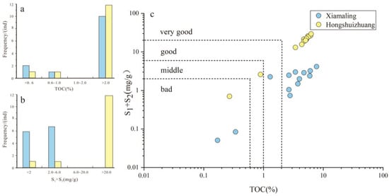 Abundance is the main component of source rock evaluation, which plays an important role in the evaluation of hydrocarbon generation, expulsion, adsorption, and storage. The total organic carbon (TOC) is expressed as the mass fraction of organic carbon contained in the rock under the unit mass, combined with the hydrocarbon generation potential (S1 + S2), reflecting the total amount of hydrocarbon generated by the source rock under the unit mass, which is widely used in the rapid analysis of organic matter abundance in source rocks [,]. As shown in Figure 2, the TOC content of the Xiamaling Formation samples is distributed between 0.17 and 7.71%, with an average of 3.5%, and the hydrocarbon generation potential is distributed between 0.05 and 4.15 mg/g, with an average of 1.98 mg/g. The TOC content of the Hongshuizhuang Formation samples is distributed in the range of 0.27–6.26%, with an average value of 4.47%, and the hydrocarbon generation potential is distributed between 0.05 and 4.15 mg/g, with an average value of 1.98 mg/g. The frequency distribution of TOC in the two formations is similar, but the hydrocarbon generation potential (S1 + S2) is quite different. The samples from Xiamaling Formation are mainly concentrated at less than 6.0 mg/g, while samples from Hongshuizhuang Formation are mainly concentrated at greater than 20.0 mg/g.