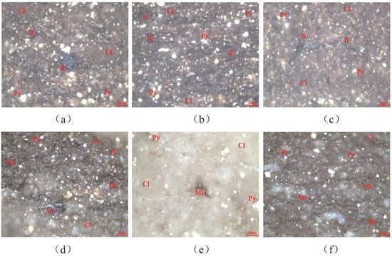 The macerals under the whole rock microscope. (a) CQ1–5, Hongshuizhuang Formation, uniform distribution of pyrite particles; (b) CQ1–9, Hongshuizhuang Formation, fracture and pore development, asphaltene filling; (c) CQ1–11, Hongshuizhuang Formation, asphaltenes filled in pores, and pyrite distributed in agglomerates; (d) CQ2–1, Xiamaling Formation, short-banded carbon asphalt; (e) CQ2–3, Xiamaling Formation, scattered distribution of pyrite; and (f) CQ2–6, Xiamaling Formation, a large number of microsomes evenly distributed.