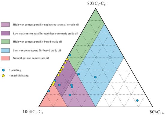 Pyrolysis gas chromatography minimizes secondary reactions and enables the identification of various original components bonded to organic macromolecules, thereby providing detailed molecular composition information on the kerogen and hydrocarbon types generated. By establishing a carbon number ternary diagram of pyrolysis products with different alkyl chain lengths, the organic phase of source rocks can be predicted. As shown in Figure 4, Hongshuizhuang Formation source rocks mainly produced low-wax-content paraffin–naphthene–aromatic crude oil with some gas and condensate oil, indicating the stronger aromaticity of kerogen functional groups. Xiamaling Formation source rocks predominantly produced crude oil with some paraffin-based crude oil; their higher wax content reflected a higher average molecular weight of pyrolysis products and the richer-than-normal long chain structure of organic functional groups on kerogen.