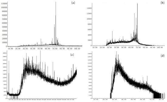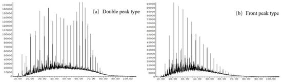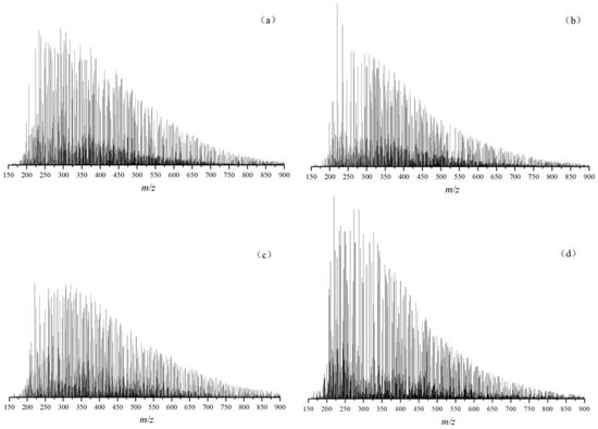Thousands of mass spectrum peaks appear in the FT–ICR MS; according to the ionization characteristics, the APPI positive ion mode is more suitable for the detection of hydrocarbon and non-hydrocarbon heteroatom compounds, with a total of more than 9900 species detected [,]. Figure 10 shows the total ion mass spectrum of typical Mesoproterozoic organic matter that could be revealed in APPI positive ion mode combined with FT–ICR MS. The initial peak of m/z (the mass charge ratio) almost started from m/z = 150, and the compound signal tended to be weak after approaching m/z = 800. The m/z of the identified hydrocarbon and non-hydrocarbon heteroatom compounds were mainly distributed between 200 and 600. The type showed a single peak characteristic generally, and the intensity of the overall compound peak was higher.