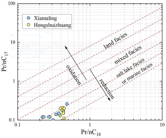 In addition, isoprenoids are frequently employed as indicators for identifying oxidation-reduction sedimentary environments, with pristane (Pr) and phytane (Ph) being the most prevalent biomarkers. The correlation diagram of Pr/nC17 and Ph/nC18 can provide insights into the source of organic matter and the sedimentary environment. As depicted in Figure 7, samples from Hongshuizhuang and Xiamaling occupy the lower left corner of the diagram, indicating a relatively dense distribution. This suggests that the parent materials of both formations primarily consist of lower aquatic plants or bacteria found in saline lakes or marine facies, implying a closed and strongly reducing sedimentary environment. These findings are consistent with those inferred from n-alkanes.
