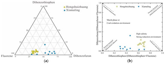 From Figure 8a, it can be seen that the trifluorene series compounds of the Mesoproterozoic Hongshuizhuang source rocks in North China showed the distribution characteristics of sulfur fluorene > fluorene > oxygen fluorene, which characterizes the sedimentary environment with strong reducibility, while the trifluorene series compounds of the Xiamaling source rocks showed the distribution characteristics of sulfur fluorene ≈ fluorene > oxygen fluorene, which characterizes the normal reduction-strong sedimentary environment. In the samples of the Hongshuizhuang Formation, the sulfur fluorene series compounds were dominant, and the content was distributed between 56.0 and 67.8%, with an average of 61.8%; fluorene series compounds followed, distributed between 27.4% and 38.4%, with an average of 32.2%; the proportion of oxygen fluorene series was very low, with an overall average of 5.8%. In contrast, the content percentage of trifluorene series compounds in the Xiamaling Formation varied greatly, among which sulfur fluorene and fluorene series compounds were the main components, and the content of sulfur fluorene compounds was distributed between 27.7% and 69.0%, with an average of 41.9%; the content of fluorene series compounds was 29.9–67.3%, with an average of 52.9%; the content of oxygen fluorene series compounds was lower than that of the Hongshuizhuang Formation, with an average of 5.19%. Since the distribution characteristics of trifluorene series compounds were not suitable indices for samples in the transition stage between oxidation and reduction, the sedimentary environment could be better identified through the intersection diagram of ∑ SF/∑ (F + SF) and ∑ OF/∑ (F + OF) (Figure 8b). The distribution of Hongshuizhuang samples was relatively concentrated. The range of the ∑ SF/∑ (F + SF) value was 0.59–0.71, with an average of 0.65, and the range of the ∑ OF/∑ (F + OF) value was 0.09–0.23, with an average of 0.15, showing a strong reducing environment with high salinity, which indicated that it was very likely to have been a closed seawater environment during deposition. The distribution of Xiamaling samples was discrete. The range of the ∑ SF/∑ (F + SF) value was 0.30–0.69, with an average of 0.44, and the range of the ∑ OF/∑ (F + OF) value was 0.03–0.32, with an average of 0.08. Although the Xiamaling Formation was also a reducing environment, its reducibility was weaker than that of Hongshuizhuang Formation.