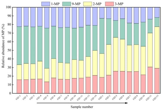 The composition and distribution characteristics of methylphenanthrene in source rocks are illustrated in Figure 9. In the Hongshuizhuang Formation (well CQ1), the relative content of 9-methylphenanthrene among the methylphenanthrene isomers was the highest, with a minimum value above 30%. Following this, 1-methyl phenanthrene exhibited a relative content exceeding 20% at its lowest value. The relative contents of 2-methylphenanthrene and 3-methylphenanthrene showed minimal differences, both remaining above 10%. In contrast, the relative abundance percentages of methylphenanthrene isomers in the Xiamaling Formation (well CQ2) varied with depth. With increasing depth, there was an increase in the relative content of both 2-methylphenanthrene and 3-methylphenanthrene, while there was a decrease in the relative content of both 1-methylphenanthrene and 9-methylphenanthrene. Therefore, the methylphenanthrene index was used to quantify the thermal evolution maturity and to convert it to the vitrinite reflectance. The methyl phenanthrene index (MPI1 and MPI2) of the Hongshuizhuang Formation is obviously distributed from low to high as the depth increases; the MPI1 was distributed between 0.75 and 1.48, with an average of 0.91, and the MPI2 is distributed between 0.63 and 1.22, with an average of 0.78. In contrast, the MPI1 and MPI2 of the Xiamaling Formation showed the characteristics of “high–low–high”; according to the depth, the MPI1 was distributed between 1.81 and 5.15, with an average of 2.54, and the MPI2 was distributed between 1.14 and 2.80, with an average of 1.71. The specific data are shown in Table 1.