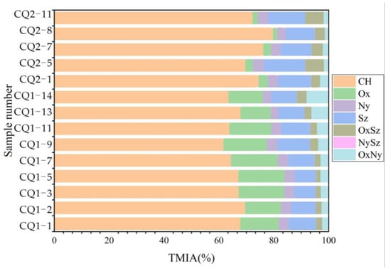 In the data analysis process, the number of atoms of O, N, and S in each organic component is represented by x, y, and z, in the form of OxNySz, to determine the composition of molecular elements and to classify the compounds. The relative abundance is represented by the percentage of TMIA, so as to visually present the relative content relationships between different components. According to the results of polar molecular compound analysis, the polar compounds detected in this study were divided into seven major compounds, namely CH, Ox, Ny, Sz, NySz, OxSz, and OxNy. As shown in Figure 11, all polar molecular compounds were dominated by CH compounds, and the proportion of CH compounds in the Xiamaling Formation was higher than that in the Hongshuizhuang Formation. The CH compounds in the Xiamaling Formation ranged from 69.8% to 79.82%, with an average of 73.60%. The CH compounds in the Hongshuizhuang Formation ranged from 61.77% to 69.63%, with an average of 65.97%. Through analysis, it was found that the research value was opposite to the TOC value, which showed that the correlation between the change in CH compound content in organic matter and the change in organic carbon content was poor.