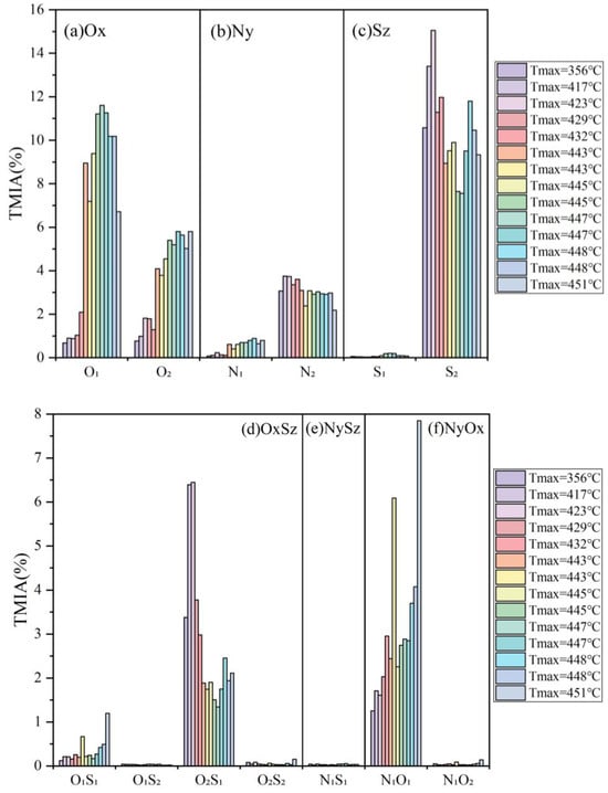 The OxSz, NySz, and NyOx polar compounds content were very low in the organic matter, and the TMIA of each compound type did not exceed 8.00% (Figure 12d–f). Among them, O2S1 compounds were the main part of OxSz, followed by O1S1 compounds, and O1S2 compounds were the lowest. The TMIA of O2S1 polar molecular compounds was distributed between 1.34% and 6.45%, with an average of 2.83%. The TMIA distribution range of O2S1 compounds in the Hongshuizhuang samples was 1.34–2.46%, with an average of 1.85%. The TMIA distribution range of O2S1 compounds in the Xiamaling samples was 2.98–6.45%, with an average of 4.60%. Therefore, the O2S1 molecular compounds of the Xiamaling Formation were more abundant than those of the Hongshuizhuang Formation, and the abundance of O2S1 compounds decreased firstly and then increased with the increasing maturity. The abundance of O1S1 compounds increased with the increase in maturity, and the abundance of O1S2 and O2S2 compounds was too low, so the trend with maturity was not obvious.