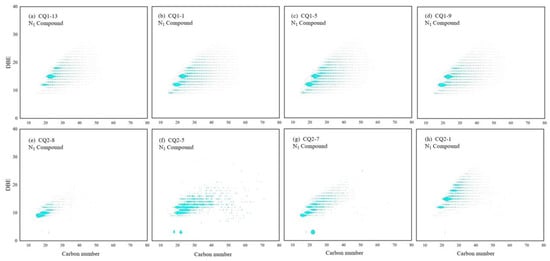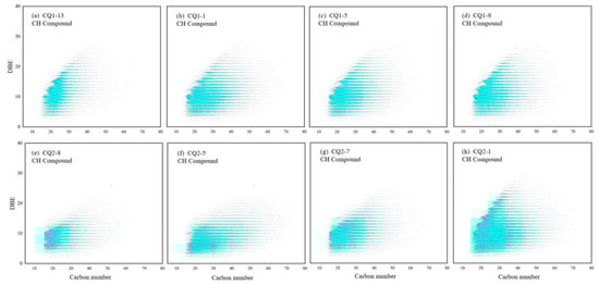 Based on the determination of the relative content of different types of polar molecular compounds, CH, N1, O1, and S1 compounds were selected for further analysis to investigate the dynamic evolution of organic molecular structures. The APPI positive ion mode was employed for detecting these aforementioned compounds []. The double bond equivalent (DBE) distribution of CH compounds is shown, according to the carbon number and DBE intersection diagram (Figure 13). By combining the types and contents of different mature samples, it was found that the TMIA of CH compounds gradually decreased with the increase in maturity, and the range of DBE and carbon number gradually increased. As shown in Figure 13e–h, it can be clearly seen that, at the immature–low mature stage, the DBE and carbon number range of CH compounds increased with maturity in the Xiamaling organic matter, which indicates that the CH compounds had more rings, and a higher aromaticity and molecular weight. However, the expansion of the DBE and carbon number range was different from the molecular polycondensation reaction of the compounds at high–over mature stage. The increase in aromaticity and molecular weight was more derived from the release of CH compounds from the Xiamaling organic matter itself, or from the removal of functional groups containing N, S, and O. The DBE of CH compounds in the Hongshuizhuang samples had a small fluctuation with the carbon number range (Figure 13a–d), which was related to the control effect of maturity with a small range of variations.