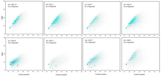 Carbon number–DBE distribution characteristics of O1 compounds in Mesoproterozoic source rocks. (a) Tmax = 443 °C, (b) Tmax = 445 °C, (c) Tmax = 447 °C, (d) Tmax = 448 °C, (e) Tmax = 356 °C, (f) Tmax = 417 °C, (g) Tmax = 429 °C, and (h) Tmax = 432 °C.