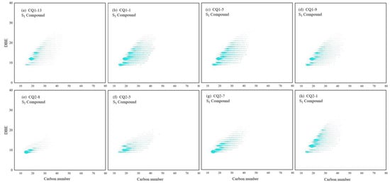 Since organic sulfur compounds may retain the original site information of carbon skeleton and related functions, they are considered to be excellent potential molecular indicators for paleoecology and paleoenvironmental assessment []. However, S1 compounds have relatively low TMIA in Mesoproterozoic organic matter, which may be related to the weak dipole moment of the sulfur–carbon bond of S1 compounds []. The DBE dot areas in the diagram (Figure 16) of most samples were 9, 10, 12, and 15, indicating that the S1 compounds in the Mesoproterozoic source rocks are mainly thiophenes [,]. In this study, it was believed that the S1 compound with a DBE value of 9 was dibenzothiophene and had an alkyl side chain of C2~C10. The S1 compound with a DBE value of 10 was dibenzothiophene with a cycloalkane ring, the S1 compound with a DBE value of 12 was naphthalene benzothiophene, and the S1 compound with a DBE value of 15 was mainly benzene ring benzothiophene, which was consistent with the detection results of the aromatic hydrocarbon biomarkers. It was found that the carbon number and DBE range of S1 compounds gradually increased with the maturity (Figure 16). In the S1 compounds with high DBE, their abundance almost increased with the increasing of maturity, whereas, in the S1 compounds with low DBE, their abundance did not show an obvious synergistic change in the relationship with the maturity, which may be related to the presence of inorganic sulfur input in the S1 compounds of marine source rocks [].